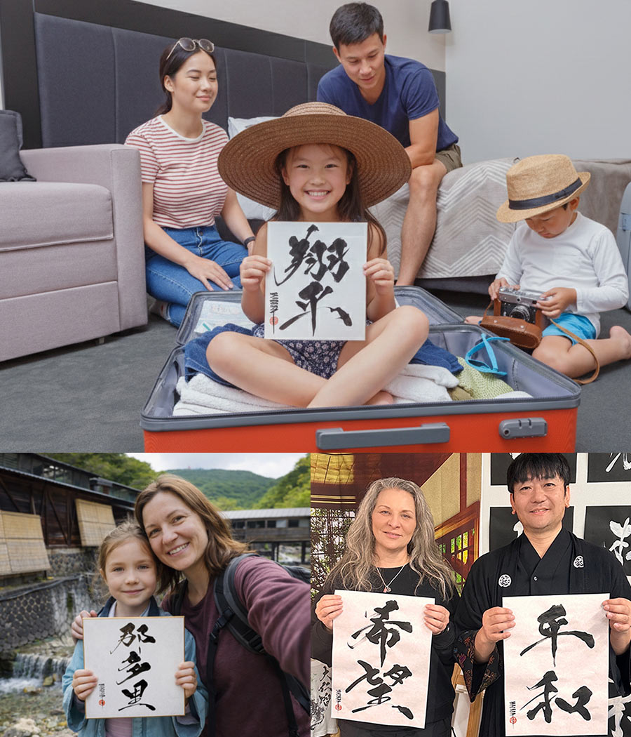 あなたの英語の名前や、好きな言葉を「漢字」に変換し、アートパネル用の作品にしたり、掛け軸や手ぬぐいを作成、世界に一つだけの作品を制作し、ホテルやご指定の住所までお届けします。