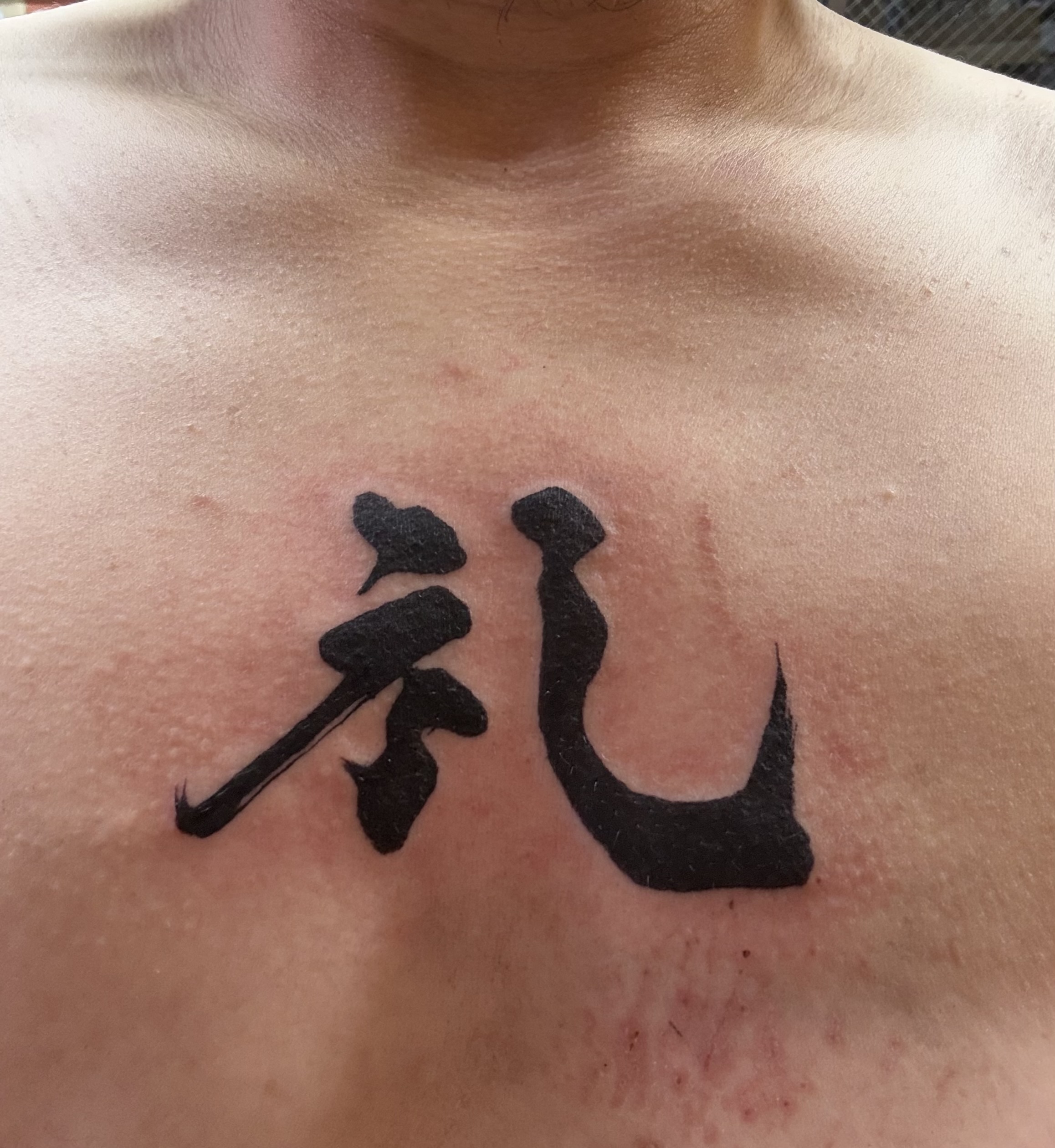 Kanji tattoo of “Rei” (礼) on the upper chest, created from Hisseki-jutsu calligraphy by calligraphy artist MADARA, symbolizing a personal vow and respect.