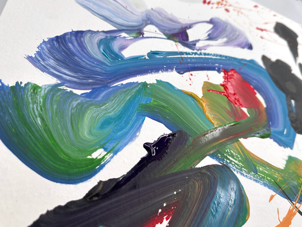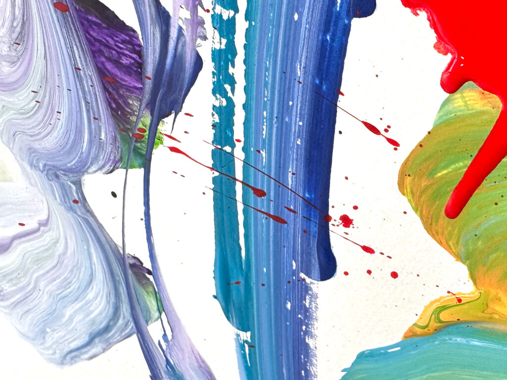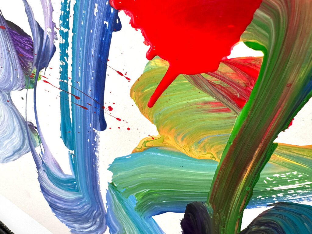 The first colors I chose were white and blue. White carried stillness; blue concealed a quiet prayer beneath its surface. With the first stroke, I felt a silence within me begin to melt away. Then came green—the cycle of life. Purple followed as memory, and crimson as heartbeat. As I let the colors drip and spread, I could feel my own inner chaos beginning to reveal itself upon the canvas.