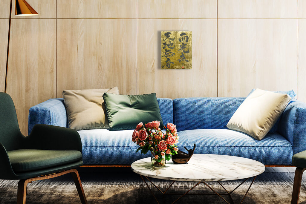 The field of gold symbolizes the infinite sky. To layer ink upon it is an act of devotion: to hear sound within silence, to discover presence within nothingness. Each stroke appears strong, yet carries profound stillness within. Light is born from silence, and silence embraces the light. They merge into one point where all dualities—sound and light, time and space, life and death—dissolve into harmony.
