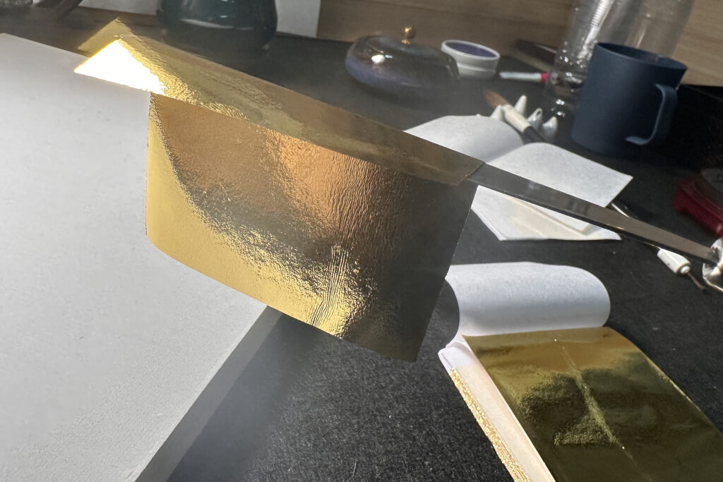 Once the surface was covered, I spent time in silence, observing how the light settled across the field of gold. Only after the gold accepted its stillness did I begin to prepare the ink. To ensure that the Sumi ink would adhere without repelling on the gilded surface, I mixed it with a small amount of acrylic medium, transforming it into waterproof ink that could flow yet remain stable.