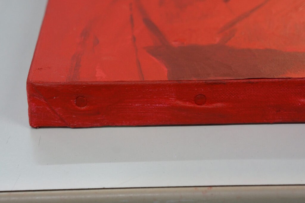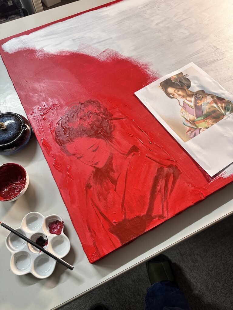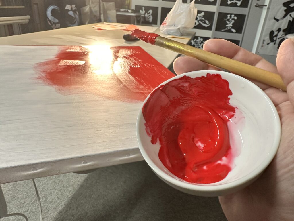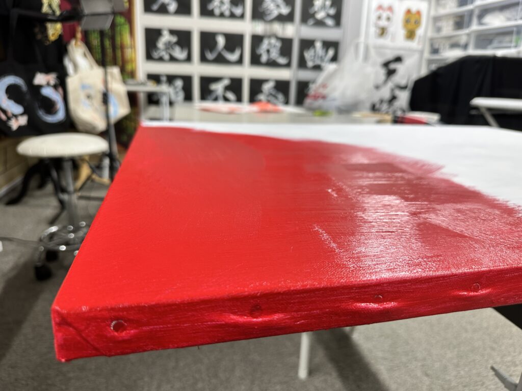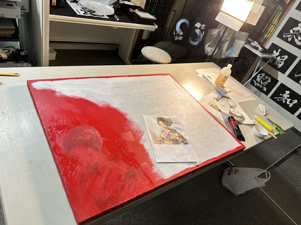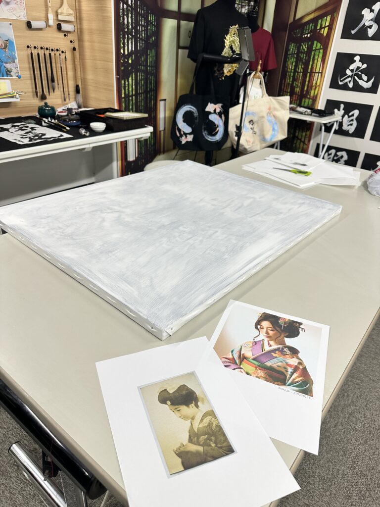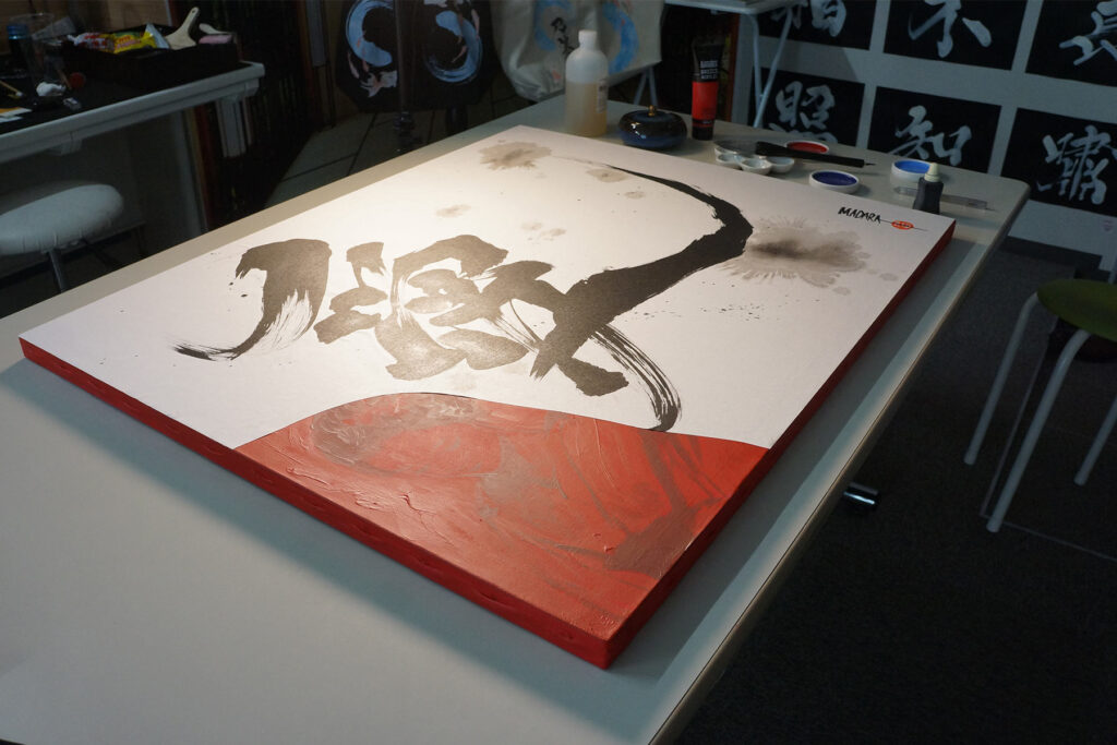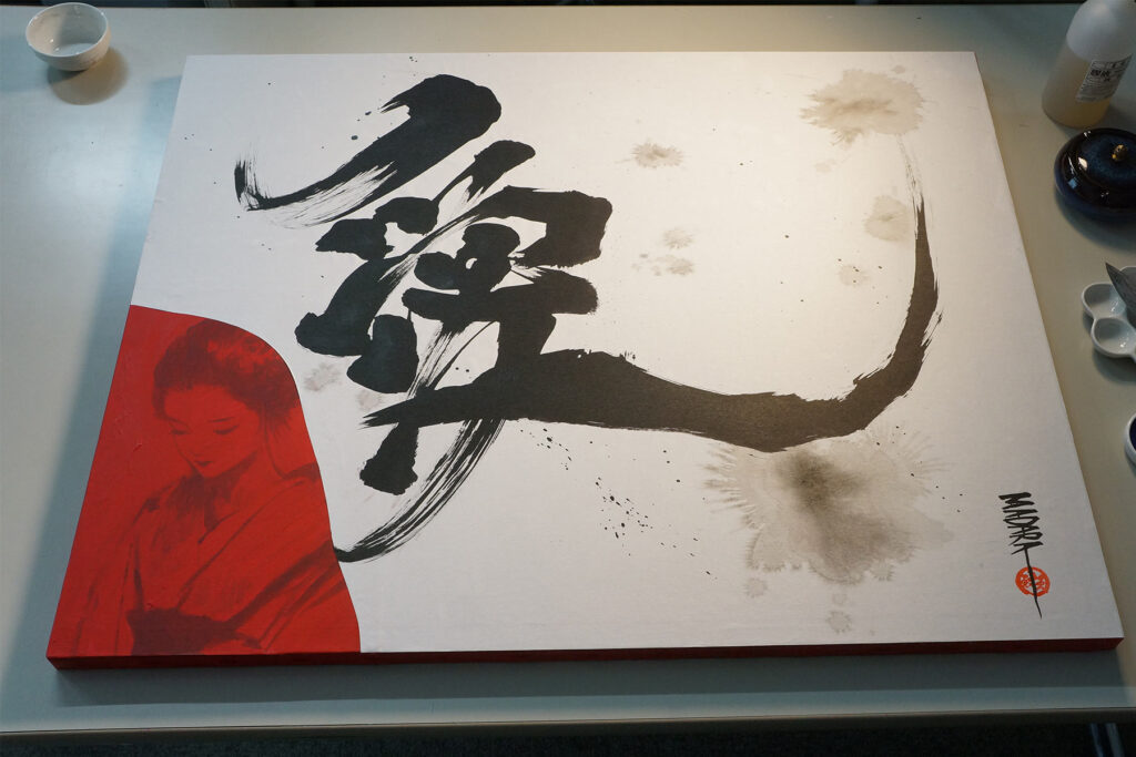 作品の仕上げ画布キャンパスの上に、アクリル絵の具で絵を描き、和紙を貼り、書道を墨汁で仕上げています。