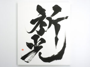 ジェッソで下地処理したウッドキャンバスに和紙を貼り、墨を置く瞬間の緊張感と、払いの柔らかな余韻を大切に書かれています。最初の一筆は「生きようとする意志」を、最後の筆致は「明日への希望」を象徴します。