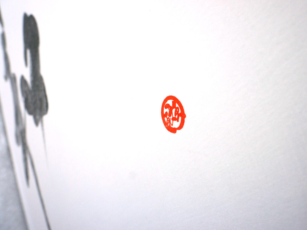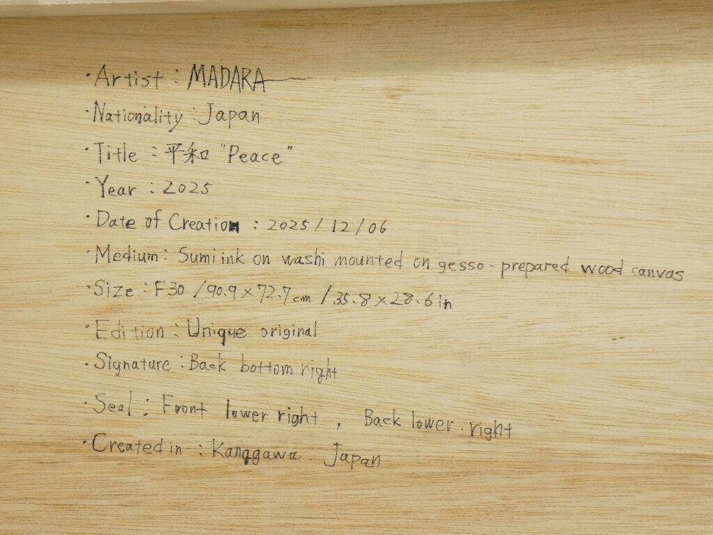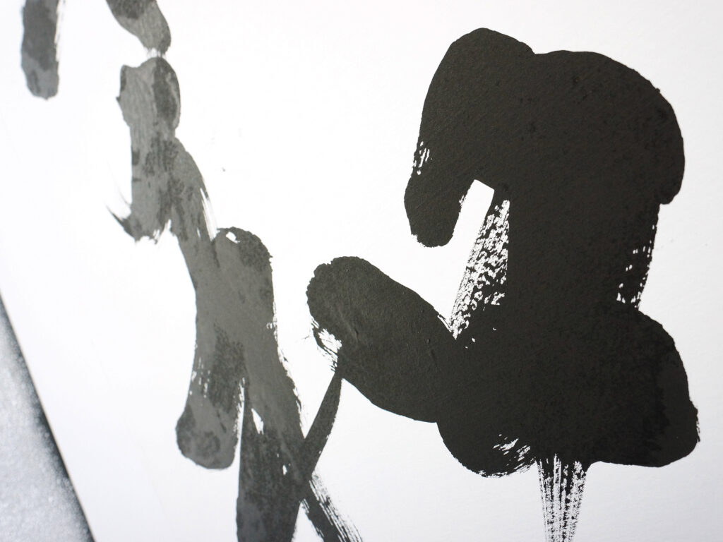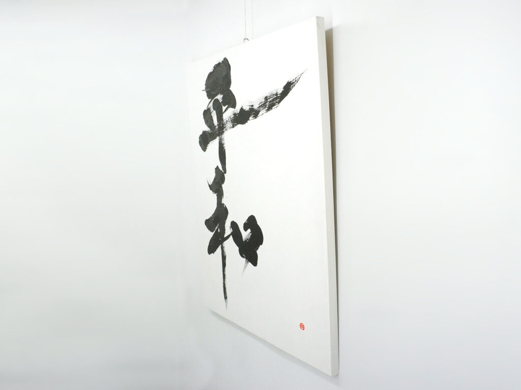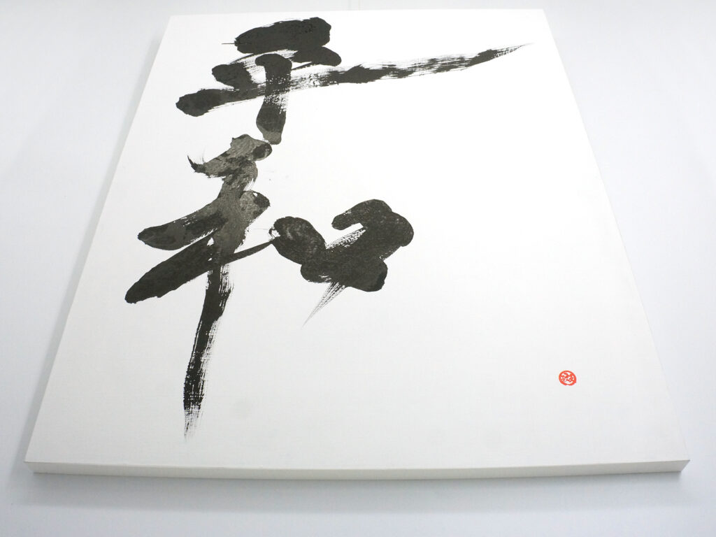 | 作品の仕上げ | 木製キャンパスの上に、ジェッソで下地処理をし、書道紙(和紙)を貼り、墨汁で描き、仕上げています。 |
