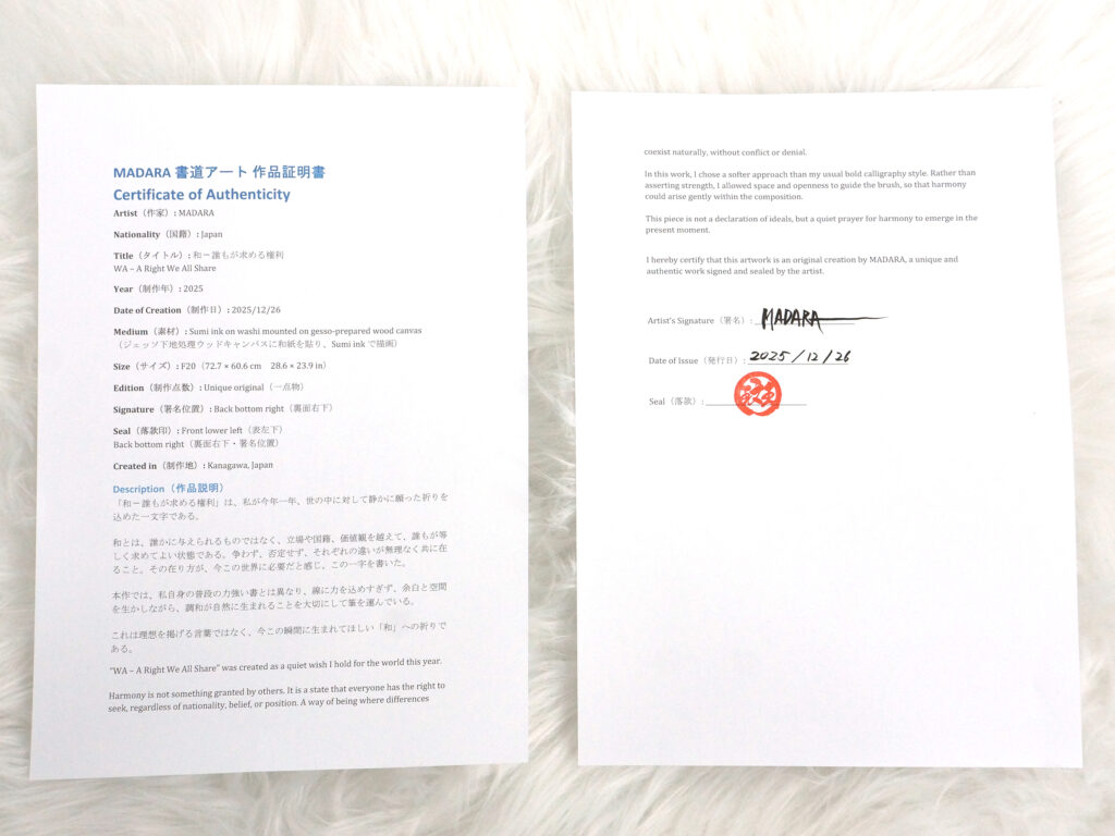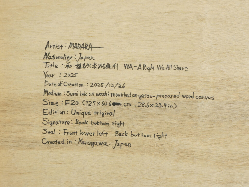 「和」という字は、調和・共存・受容を意味しますが、それは誰かに与えられるものではなく、誰もが内側に持つ権利のようなものだと感じています。この作品は、主張や答えを提示するものではありません。むしろ、余白と沈黙を通じて、鑑賞者自身が自らの内面と向き合うための空間を開きます。
