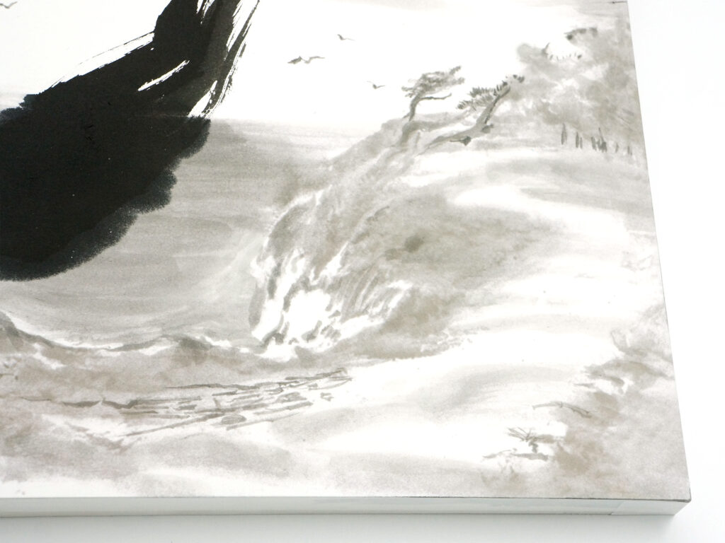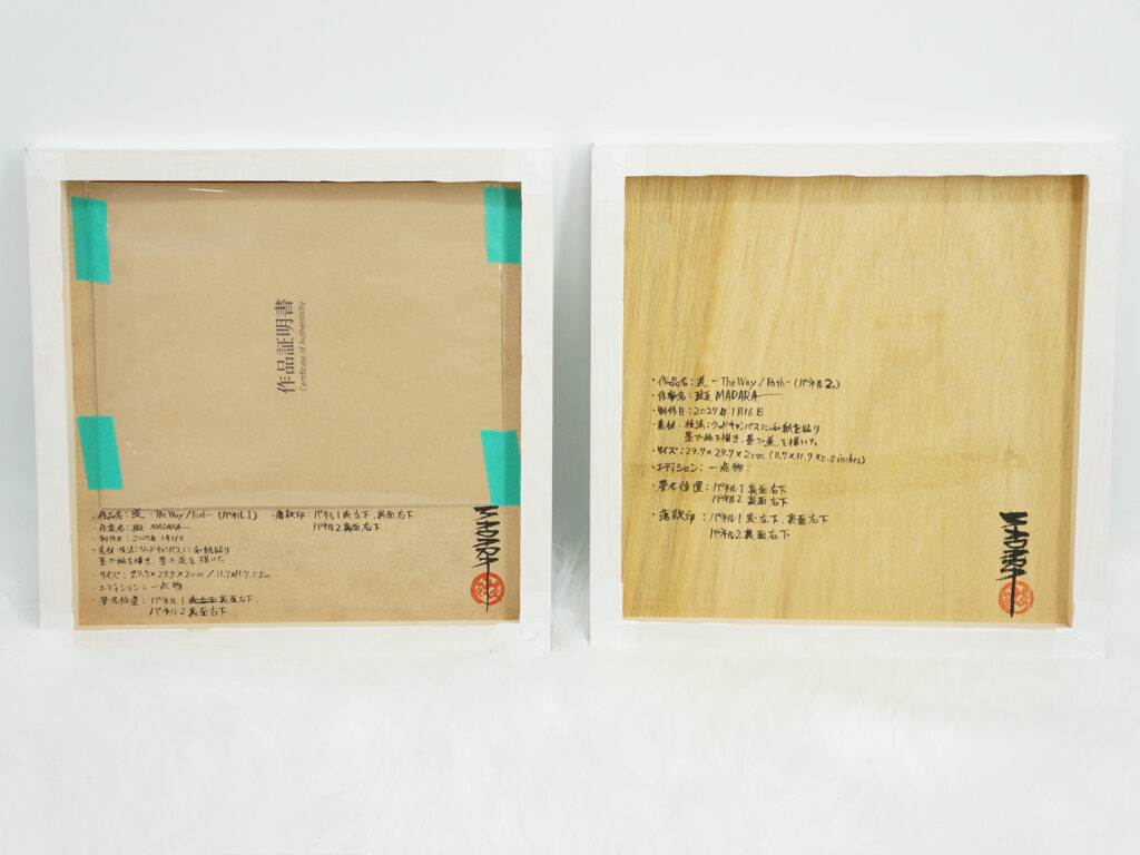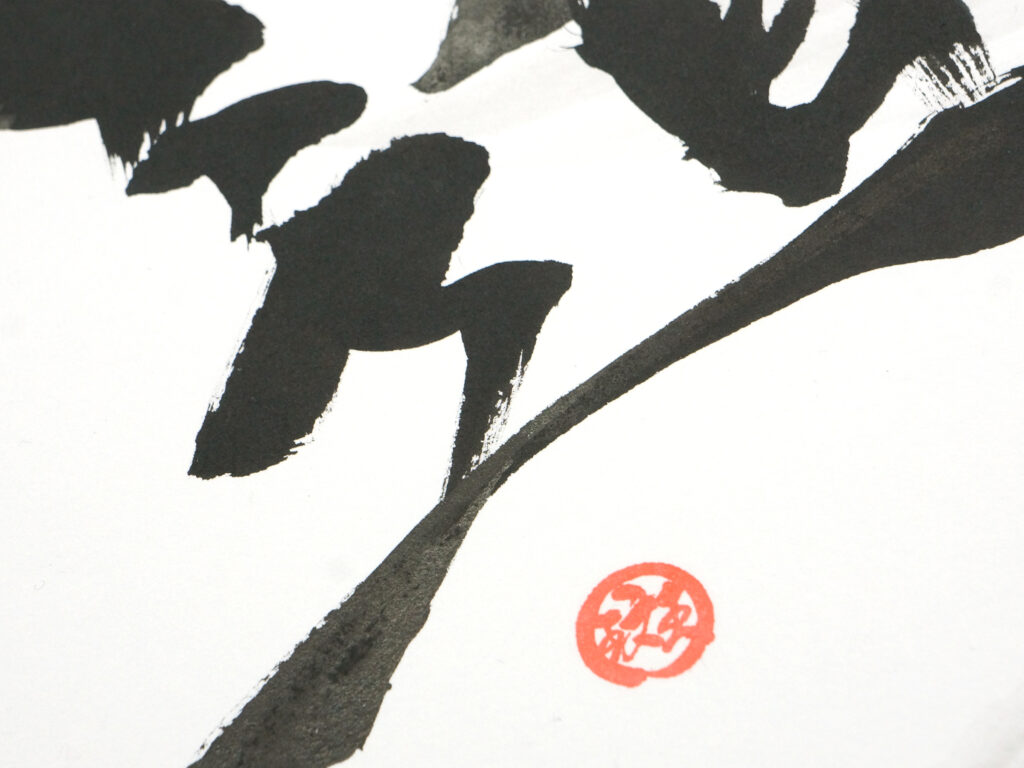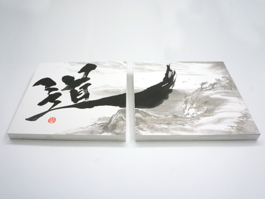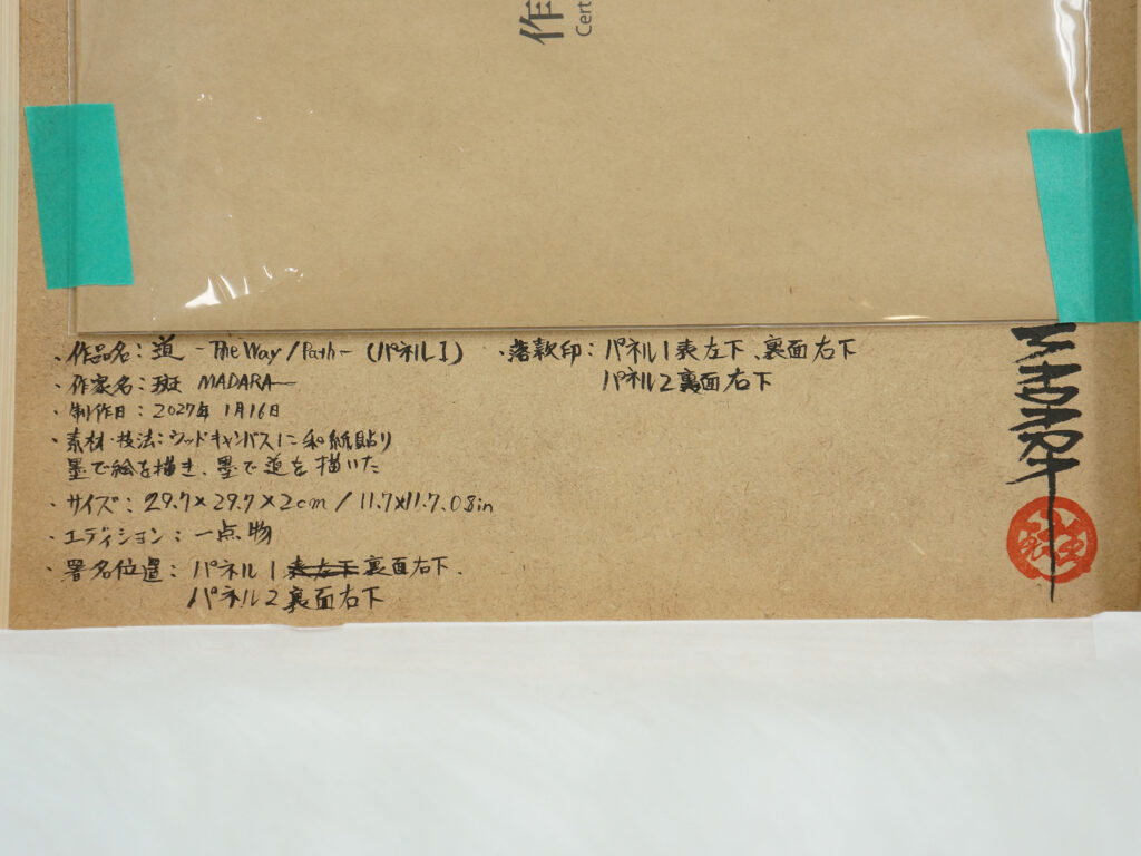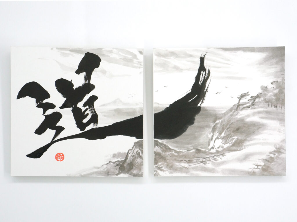 | 作品の仕上げ | 木製キャンパスの上に、和紙(書道用紙)を貼り、墨汁で仕上げています。 |