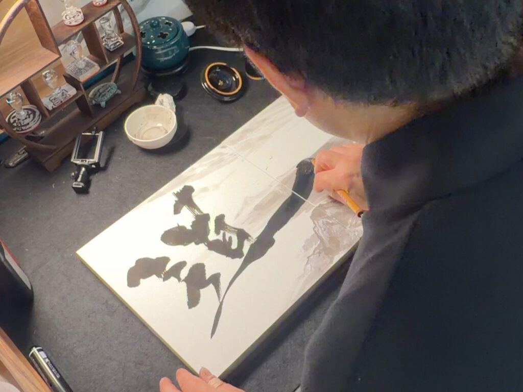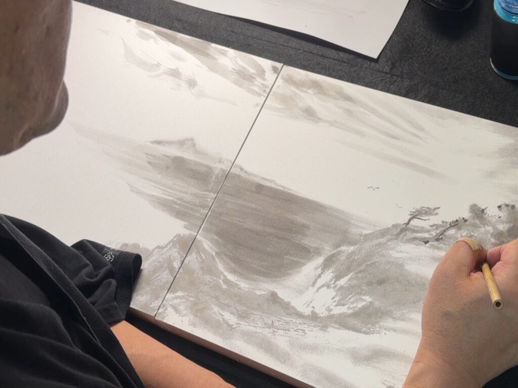 制作では、二枚を一組の作品とした。どちらか一方を完成させるのではなく、同じ時間、同じ流れの中で進めることで、わずかな違いが自然に生まれることを受け入れた。流れを整えようとする意識が強くなった瞬間には、一度筆を置き、迷いが混じったまま再開することもあった。