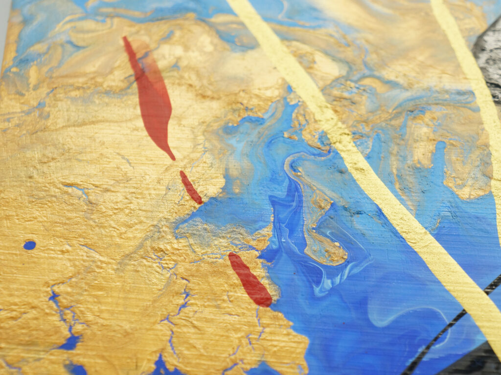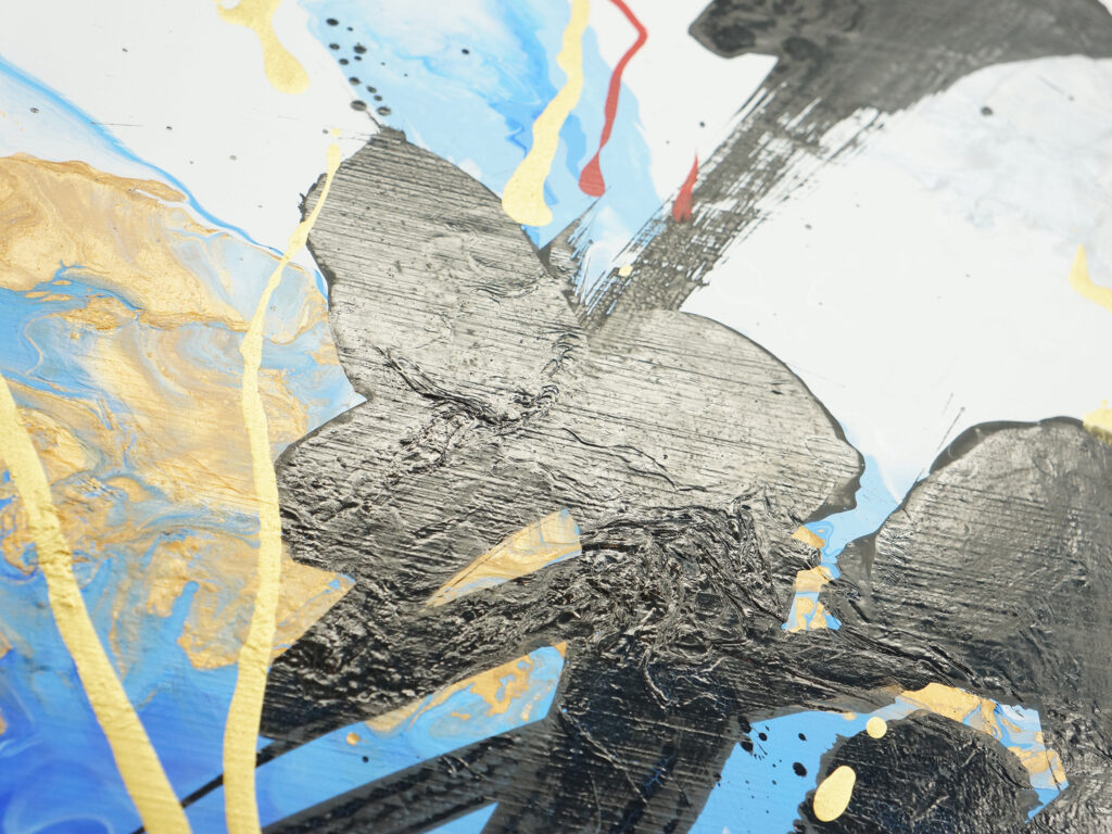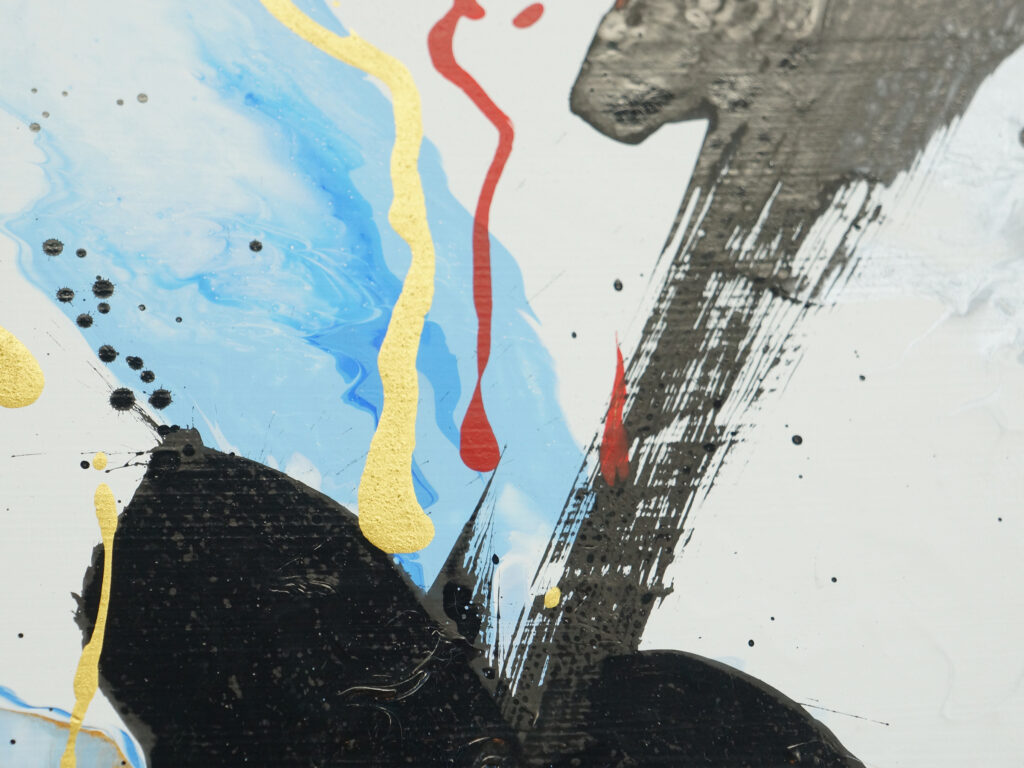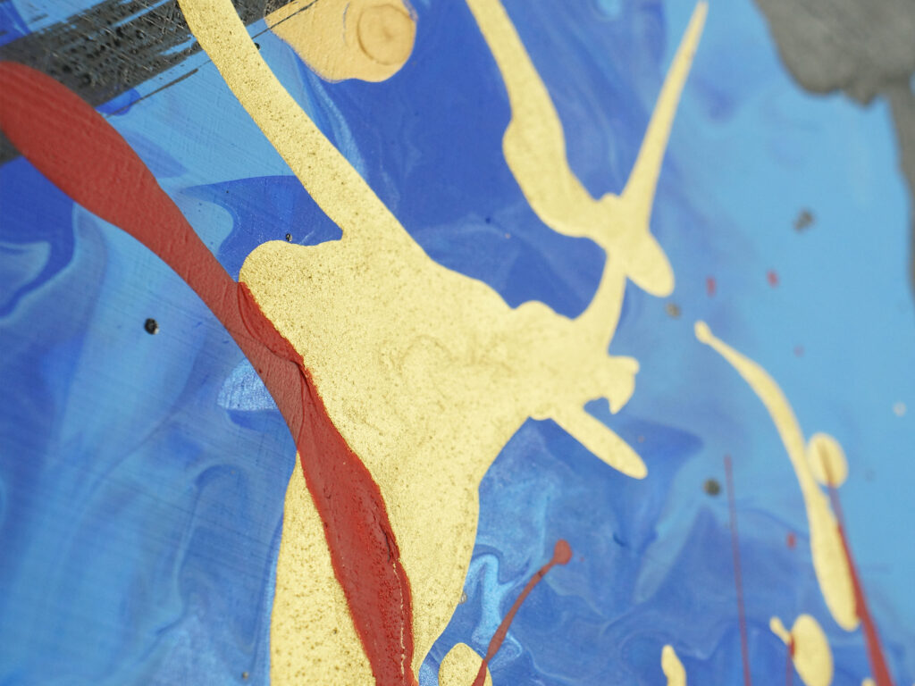 そして最後に、金色と赤の絵具をチューブからキャンバスへ直接絞り出した。筆を介さず、身体の動きと感情をそのまま画面に走らせることで、飛ぶ直前の高揚や緊張、電気が走るような一瞬を可視化した。
