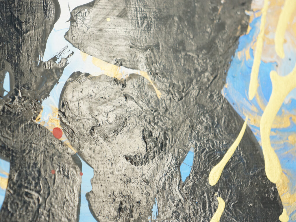 まず、やわらかく解いた絵具をキャンバスに垂らし、筆や道具で操作するのではなく、重力や流れに委ねるようにして背景を描いた。色がにじみ、混ざり合い、思いがけない形を生み出していくその過程は、意図と偶然の境界を探る時間でもある。