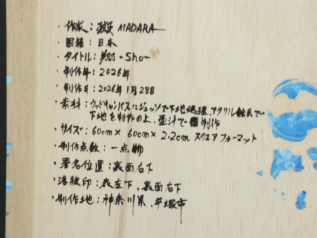 | 作品の仕上げ | ウッドキャンバスにジェッソで下地処理を施し、アクリル絵の具で下地を制作の上、墨汁で制作 |