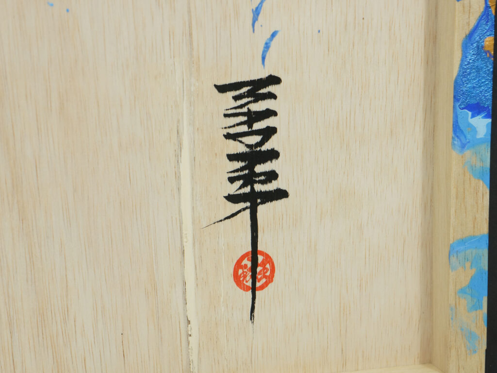 背景が定まった後、その上に書道で「翔」と一気に書き下ろした。ここでは迷いを挟まず、決断の線だけを残すことを意識している。